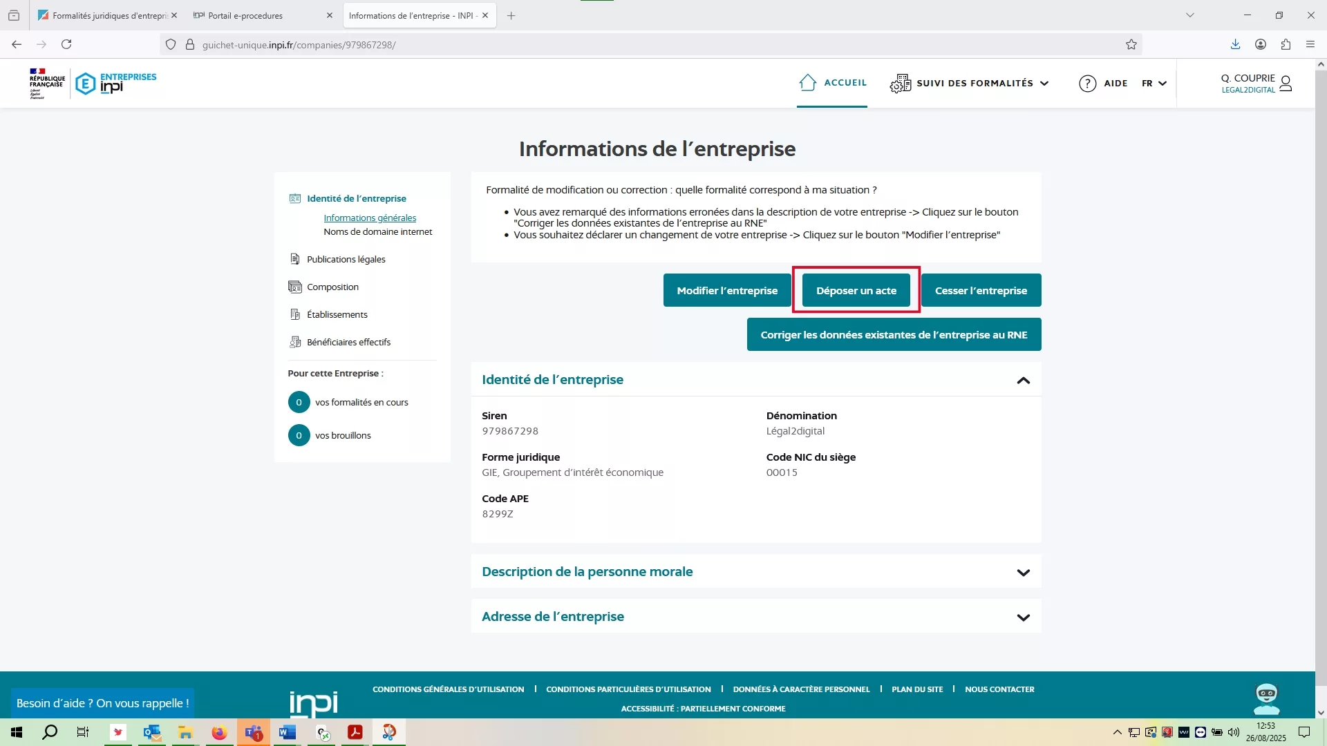 Autre exemple, je suis pressée et je réalise un dépôt d'actes pour demander la confidentialité du Kbis et, plus tard, je peux faire une demande d'anonymisation d'actes à nouveau via un dépôt d'actes.