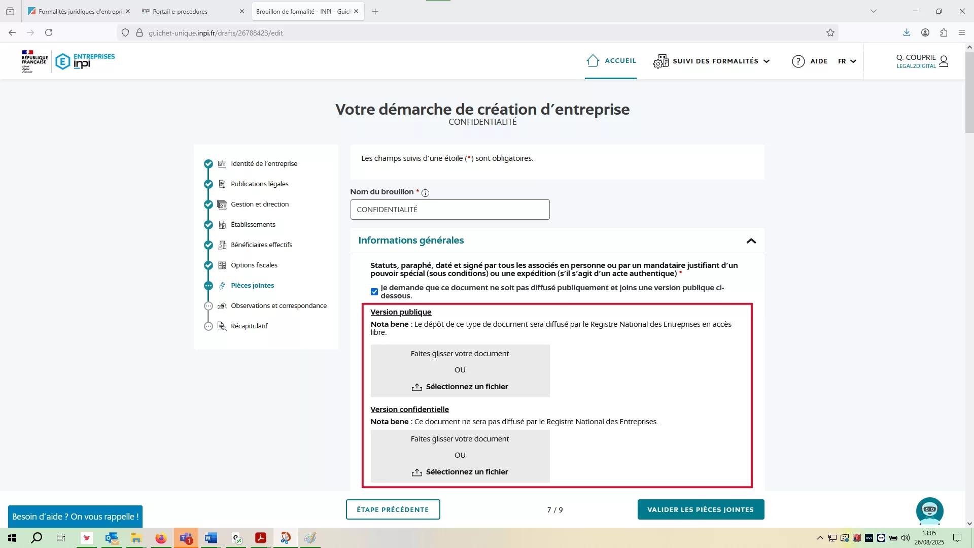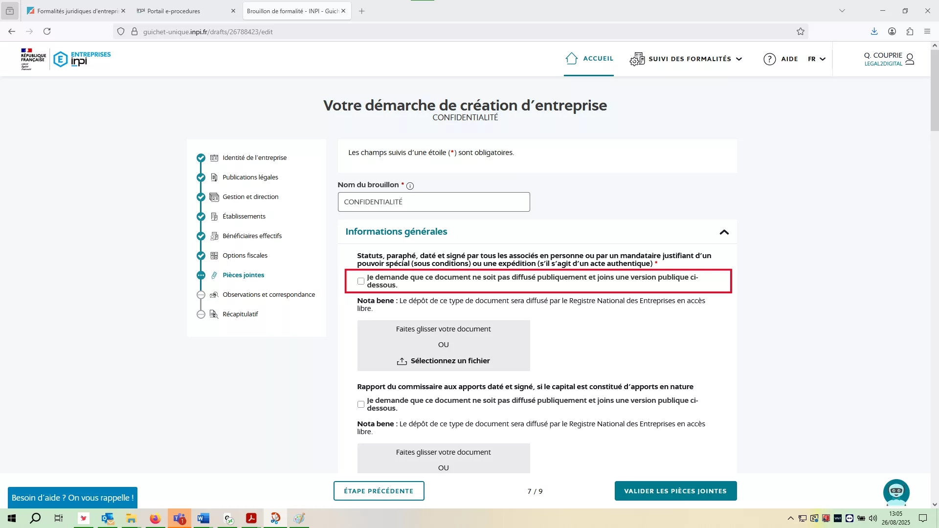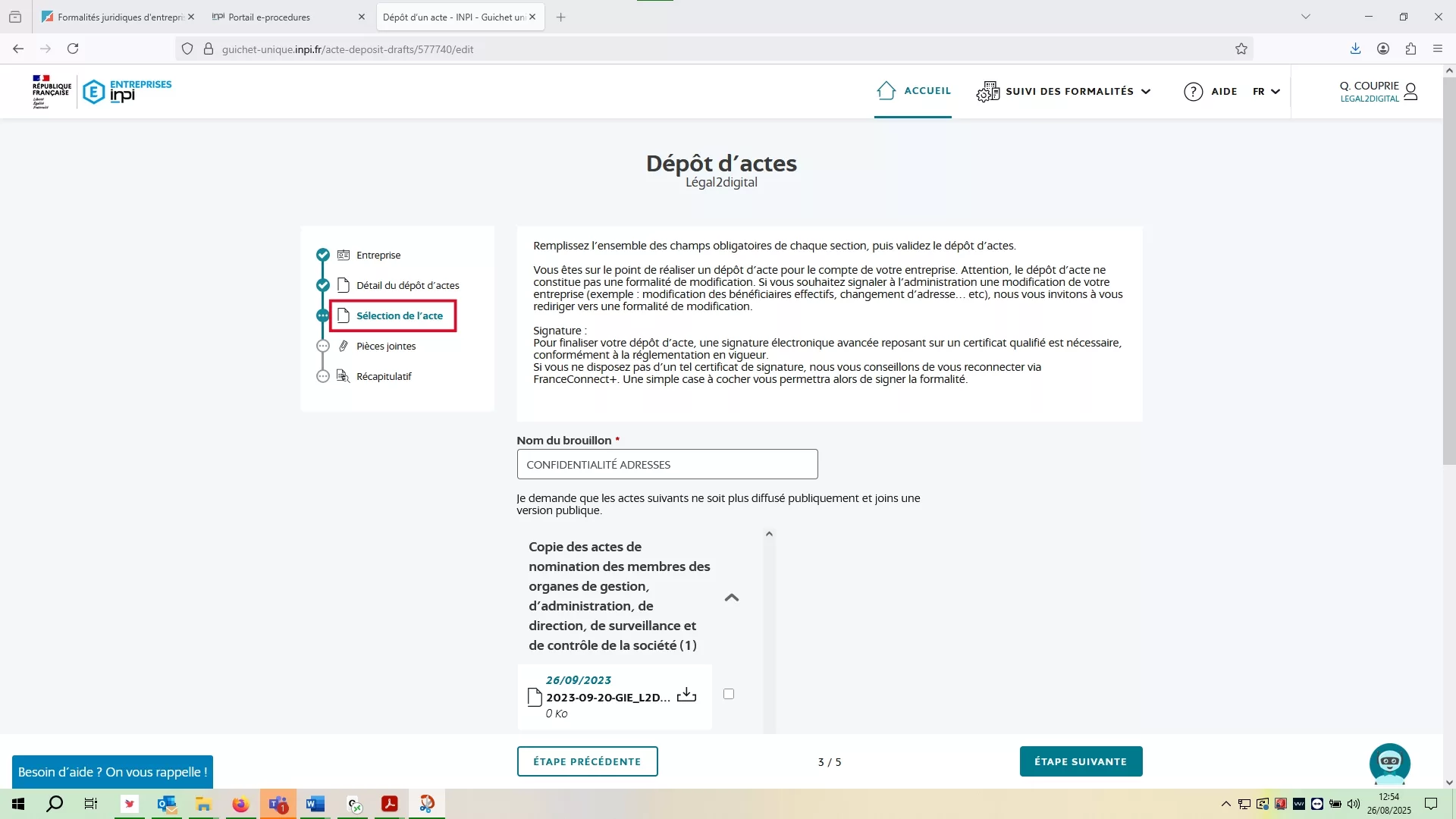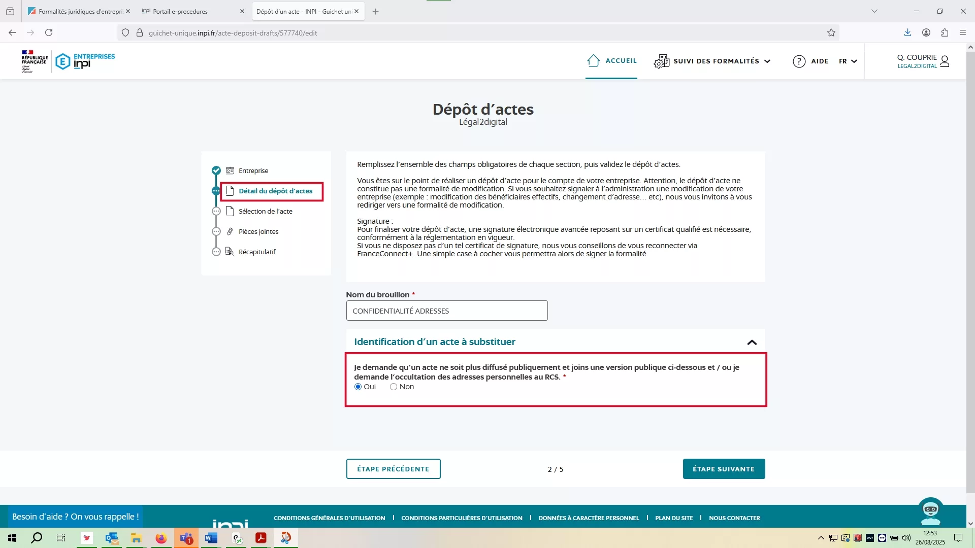 Oui et pour se faire, je dois réaliser une formalité de demande de confidentialité via l'onglet "Dépôt d'acte".