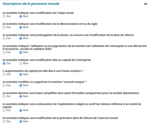 A titre d’exemple, si vous souhaitez déposer un dossier d’augmentation de capital, il faudra bien évidemment cocher OUI face à la phrase « je souhaite indiquer une modification liée au capital de l’entreprise ». Puis, votre devrez compléter tous les champs proposés par le Guichet Unique sans quoi votre formalité de modification ne pourra pas être validée. Les champs proposés seront pré remplis ou non et seront relatifs à la mise à jour des données RNE. Vous devrez notamment compléter les informations relatives aux dirigeants (leur fonction, genre, nationalité, lieu de naissance etc…), l’adresse du siège et des établissements, la catégorisation, les bénéficiaires effectifs.